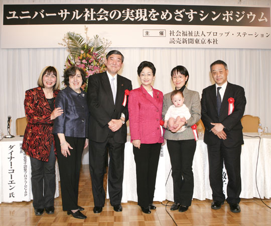 Mr. Ishiba, the Minister of Defense, please come on stage. Ms. Toshiko Hamayotsu, leader of the Universal Society Project Committee and I am sure this person needs no introduction, but she wrote the famous book, my closest friend Ms. Mitsuyo Ohira (lawyer). Actually, Ms. Ohira has a baby daughter and she is here with the baby and her husband, but they have just stepped out for just now. Now also we have Mr. Takashi Kiriku who is Senior Managing Director of Nippon Keidanren, the supporter of this symposium. Also, we would like to ask Ms. Cohen to be at that table on stage as well.