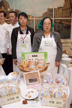 Master Junji Yagi, the technical director of Morozoff Ltd., (also the first foreign national who was authorized Confectionery Master by the Austrian Government), Master Noriyuki Nagai of the French pastry shop "Noliette", Master Takaaki Nishikawa of Kobe's "Boulamgerie Comme Chinois", and Master Takahiko Nozawa of the Viennesse sweets shop "Konditorei Neues" have been teaching the students how to create various pastries and bread for six months including Madeleine, Chocolate Mousse, Mousse with Raspberry and Yogurt, Nusbeugel, Kase Gebackene, Potato Bread, Galette with Bacon and Cheese, bûche de Noël, and Speculos. The completion ceremony was also used as an opportunity for the students to display their accomplishments using the skills that they have acquired during the program.