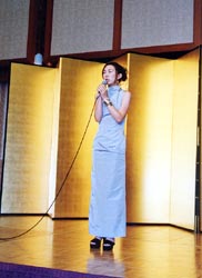 Hanako Oshima singing at the welcome party. She is a daughter of the late Kyu Sakamoto, one of the most popular singers in Japan. She recently released a CD and eagerly works for welfare.