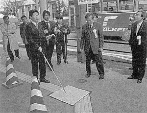 11日、柳町通りであったデモンストレーションでは、国土交通省が進めるプロジェクト推進委員会委員長の坂村健・東京大学院教授が「青森が先陣を切って始めるプロジェクトを全国に広げていきたい」とあいさつ。視覚障害者が持つ白いつえの先に取り付けられた機械が情報を読み取る仕組みを説明した。