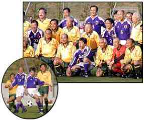 午後には宮城県サッカー協会と全日本サッカー協会の親善試合がおこなわれ、 殿下は全日本チームとしてご出場になられました。 殿下のシュートで先制点を取った全日本はその後も押しぎみで試合をすすめ、3:0で全日本が勝ちました。 記念写真の殿下の後ろには、釜本選手の姿もみえます。 |
