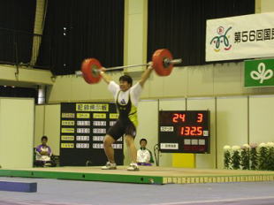 ウエイトリフティング少年の部105kg級スナッチ競技で秋田県代表の高橋俊郎選手(秋田経済法科大学付属高校)が、自身が持つ高校生記録の130.0kgをさらに上回る高校新記録132.5kgを出し、1位になりました。左の写真は、132.5kgを持ちあげる瞬間です。 |