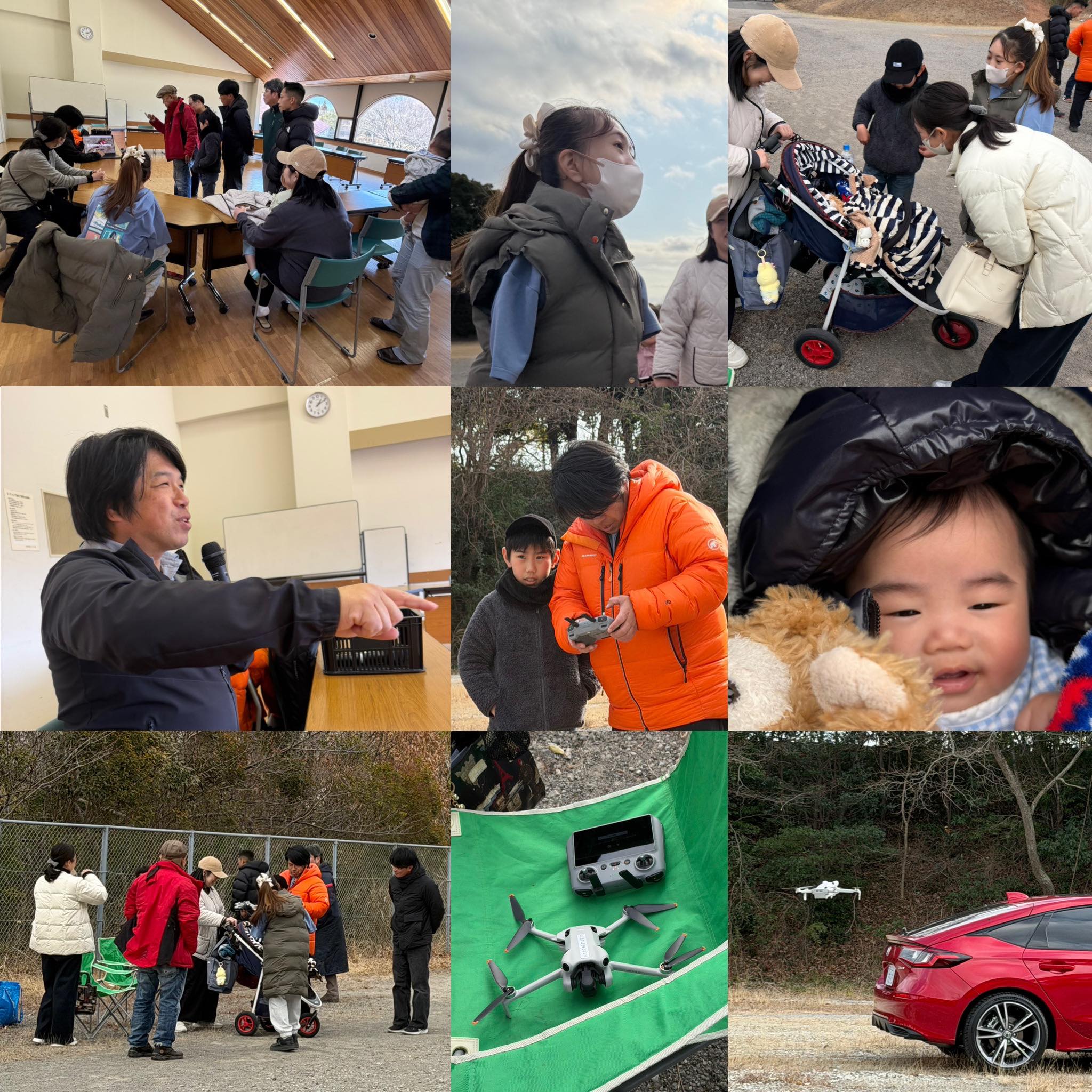 赤ちゃんの可愛らしさは、まさに「ドローンを超えるねぇ(笑)」と、皆んなが何度もベビーカーの周りに集まり、赤ちゃんを覗き込みながら、和気藹々と、飛行訓練が進みました。