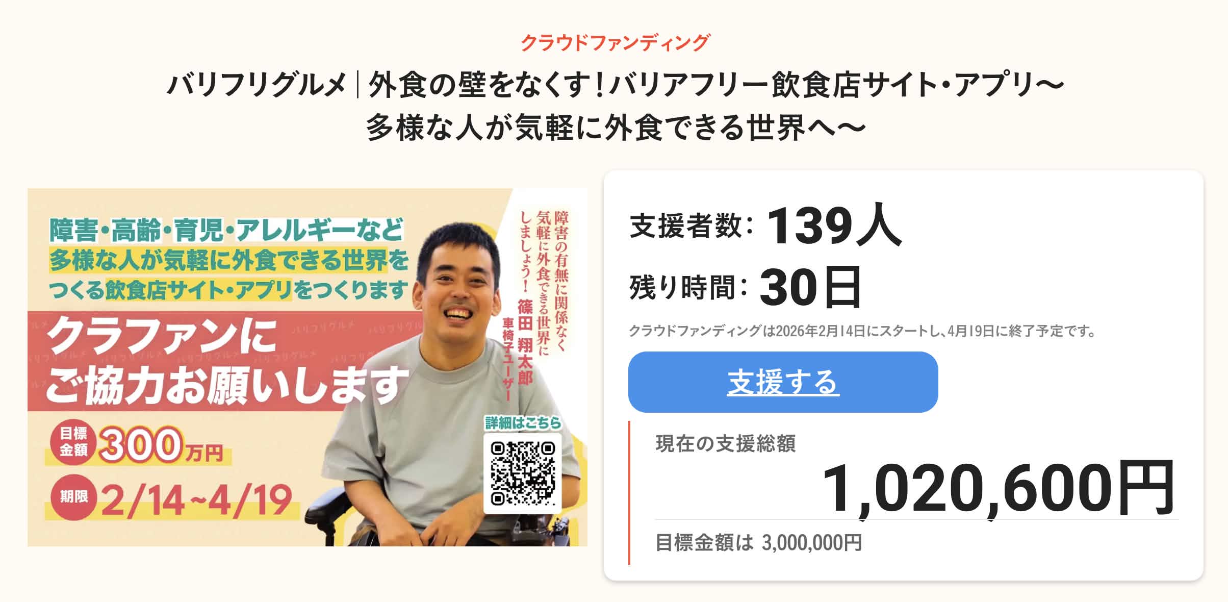 外食の壁をなくす!バリアフリー飲食店・アプリ「バリフリグルメ」のクラウドファンディングが、100万円を突破しました。