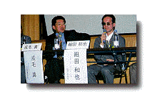 成毛社長に突っ込んだのはプロップ・ステーションの会員で淑徳大学4年の細田和也さん。全盲の視覚障害者である細田さんは、音声認識ソフトを日本語版ウィンドウズ95に入れても、ほとんどのアプリケーションが英語版と同様には「しゃべらない」点を指摘した。あわせて、健常者を前提としたGUI環境が全盛である現在、視覚障害者が習得したDOSの知識が、就職などに生かしにくい状況であることを訴えた。細田さんは今春から、マイクロソフトのOS開発に関するコンサルタントを務めており、成毛社長は「実際に使っている障害者の方々の声を聞くと、予想以上の不具合を実感した」という。