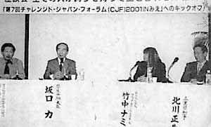 IT(情報技術)を活用した障害者の就労や学習を考える座談会が17日、久居市新町のポルタひさいで行われた。今年11月1、2両日、磯部町坂崎の志摩スペイン村で開催される「第7回チャレンジド・ジャパン・フォーラム2001 インみえ」のプレイベント。坂口力・厚生労働大臣や北川正恭知事らが討論し、一般市民や障害者、企業経営者、福祉団体役員、自治体職員など約130人がじっと耳を傾けた。 まず、藤岡和美・久居市長が「障害者も健常者も、すべての人たちがIT所赤いで力を発揮するため、さまざまに考えたい」とあいさつ。障害者にパソコンなどIT関連の職業訓練を行っている神戸市の社会福祉法人「プロップ・ステーション」理事長・竹中ナミさんが、「プロップ・ステーションのミッションとCJFの歩み」と題して基調講演を行った。 竹中さんは「チャレンジドは最近アメリカでよく使われ、神から挑戦という課題もしくはチャンスを与えられた人、つまり障害を持つ人のことを指す。だが、障害をマイナスとだけとらえず、自分や社会のため前向きに生かしていこうという積極的な生き方を意味する。働く意欲さえあれば,障害者にも多くの仕事がある」と述べた。 続いて「すべての人が誇りを持って生きられるIT社会を語る」と題した座談会。成毛真・前マイクロソフト社社長の市会で、坂口大臣と北川知事、竹中さんが、IT時代の障害者と健常者の職業や生き方などについて意見をかわした。 |