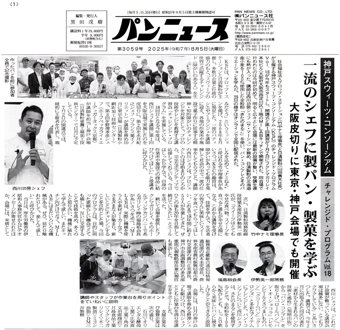 社会福祉法人プロップ・ステーション(竹中ナミ理事長)と日清製粉(山田貴夫社長)が主催する神戸スウィーツ・コンソーシアム(KSC)のチャレンジド・プログラムVol.18が今年もスタートし、開講式と第1回講習が7月2日にフクシマガリレイ本社ビル(大阪府大阪市西淀川区)1階のMlLABキッチンで開催された。同会場で行われたのは今回が初めて。明るく広々とした会場には最新の設備が整い、受講生達にも熱が入った。講師は西川功晃シェフ(サ・マーシュ)が務め、日清製粉の北海道産小麦を100%使用した全粒粉「きたのまるこ」を使い、パン・コンプレとそのバリエーションを学んだ。当日の様子はオンラインで全国に配信された。