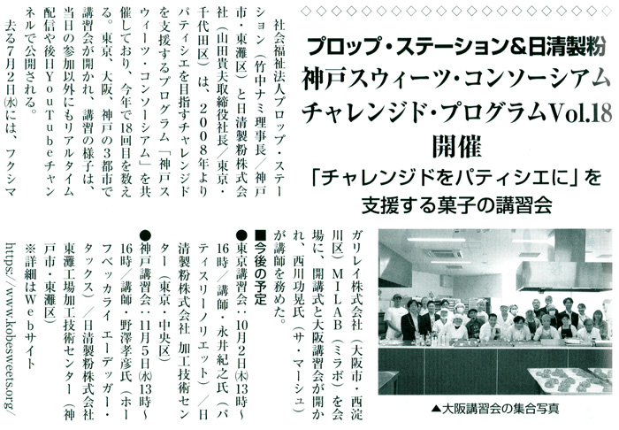 社会福祉法人プロップ・ステーション(竹中ナミ理事長/神戸市・東灘区)と日清製粉株式会社(山田貴夫取締役社長/東京・千代田区)は、2008年よりパティシエを目指すチャレンジドを支援するプログラム「神戸スウィーツ・コンソーシアム」を共催しており、今年で18回目を数える。東京、大阪、神戸の3都市で講習会が開かれ、講習の様子は、当日の参加以外にもリアルタイム配信や後日YouTubeチャンネルで公開される。