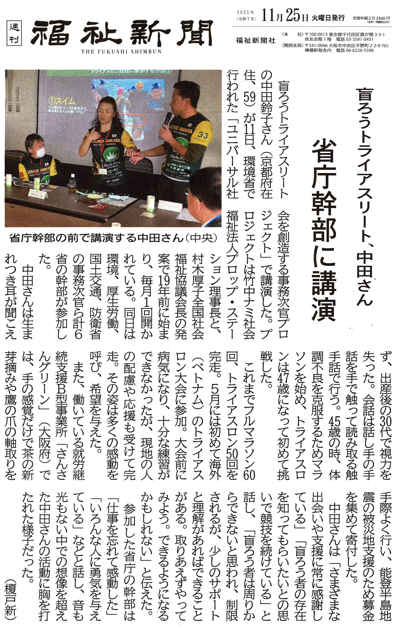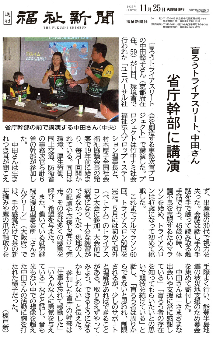 盲ろうトライアスリートの中田鈴子さん(京都府在住、59)が11日、環境省で行われた「ユニバーサル社会を創造する事務次官プロジェクト」で講演した。プロジェクトは竹中ナミ社会福祉法人プロップ・ステーション理事長と、村木厚子全国社会福祉協議会長の発案で19年前に始まり、毎月1回聞かれている。同日は環境、厚生労働、国土交通、防衛省の事務次官ら計6省の幹部が参加した。
