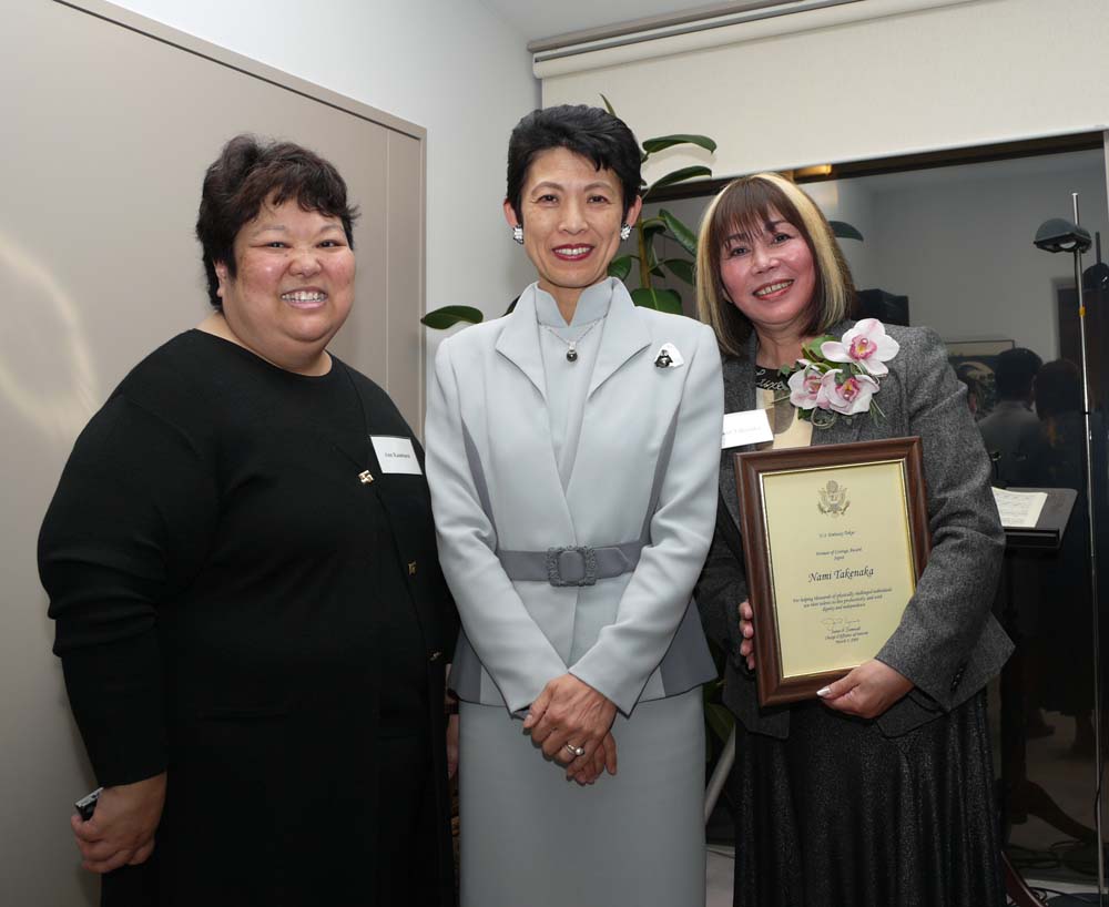 「一言、受賞のコメントをお願いします」と言われたので、「本日の受賞を心から光栄に思います。重症心身障害のチャレンジドである娘のおかげで自分の今日があります。娘自身は働けないけれど、働く意欲を持って努力を続けるチャレンジドの仲間たちやスタッフ、そしてたくさんの人たちの応援でプロップの活動が推進されてきました。今日の表彰は、そうした全ての人と一緒に受賞するという気持ちです。またプロップは米国防総省CAPと連携しながら活動を進めていますが、CAP理事長であり尊敬する友人であるダイナー・コーエンさんは昨年末、行政職員最高の栄誉である<大統領クオリティ賞>を受賞され、私の今日の受賞と合わせ、米国のチャレンジド政策の奥深さを改めて実感しています。これからも大使館の皆さん、お集まりの皆さんの温かいご支援を、どうぞよろしくお願いいたします。本日は本当にありがとうございました。」というご挨拶をさせて戴きました。
